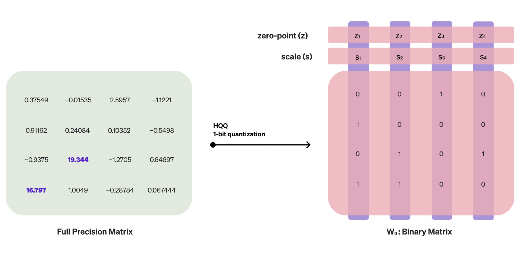 The dequantization step in HQQ can be expressed as \( W_{r} = (W_{q} - z)s \), where \( W_{r} \) represents the dequantized weights, \( W_{q} \) the quantized weights, and the meta-parameters \( z \) and \( s \) correspond to the zero-point and scaling factor vectors, respectively. To simplify the explanation in this article, we omit the reshaping steps that are necessary when employing grouping.
